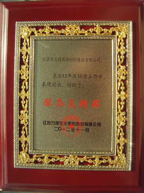 2012年,我公司凭借优质的产品质量和服务得到江苏万邦生化医药股份有限公司的认可,并授予“服务支持奖”。
