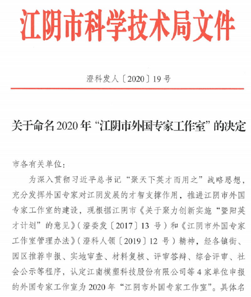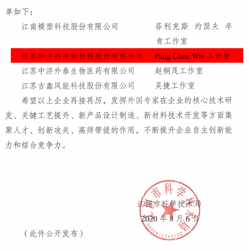 喜讯二:我司“Peng Chee wai工作室”,被江阴市科技局成功认定为 “江阴市外国专家工作室”。
