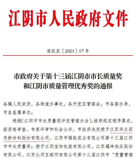 公司荣获第十三届“江阴市市长质量奖”。2021年开始的“十四五”时期,形成以国内大循环为主体、国内国际双循环相互促进的新发展格局。beat365把握国家“十四五”时期新发展阶段的新机遇和新挑战,始终把beat365制造向beat365创造转变、把beat365速度向beat365质量转变、把beat365产品向beat365品牌转变”。坚持精耕实做,强化创新、管理、融合、投资、责任意识,为开启beat365打造世界领先企业的新篇章加油!